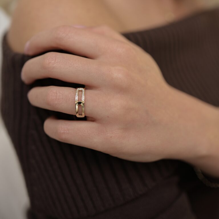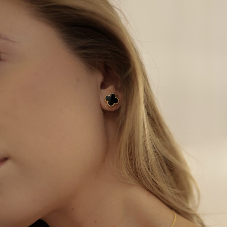 Sztywna bransoleta ze srebra pozłacanego, zakończona motywem czterolistnej koniczyny z czarnym onyksem. Subtelna elegancja i symbol szczęścia w jednym.