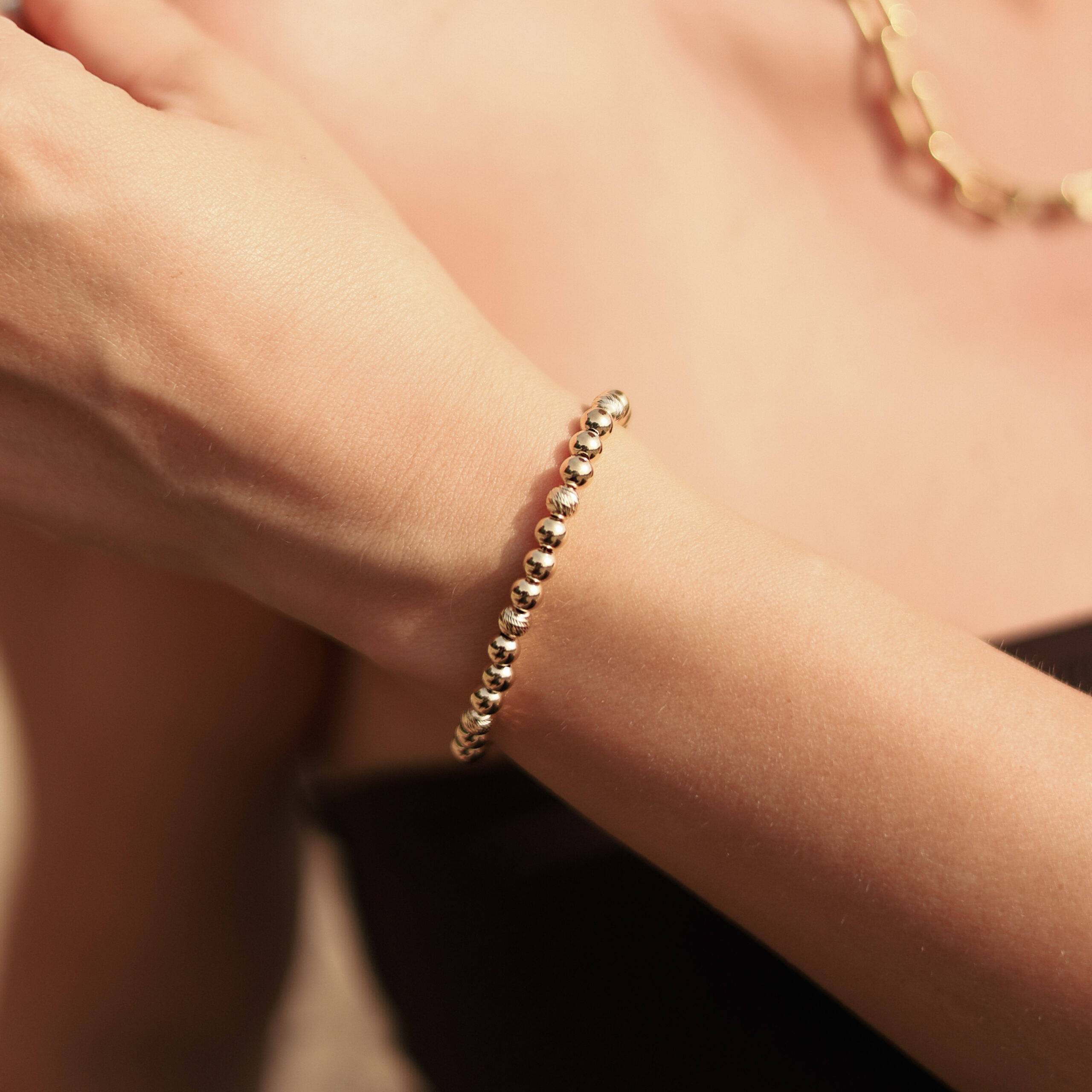 Zjawiskowa bransoletka wykonana z wysokiej jakości złota próby 585 (14-karatowego), składająca się z regularnie rozmieszczonych, połyskujących kulek. Niektóre z nich zostały ozdobione subtelnym, ryflowanym wzorem, który dodaje całości wyjątkowego blasku i oryginalnego charakteru.
