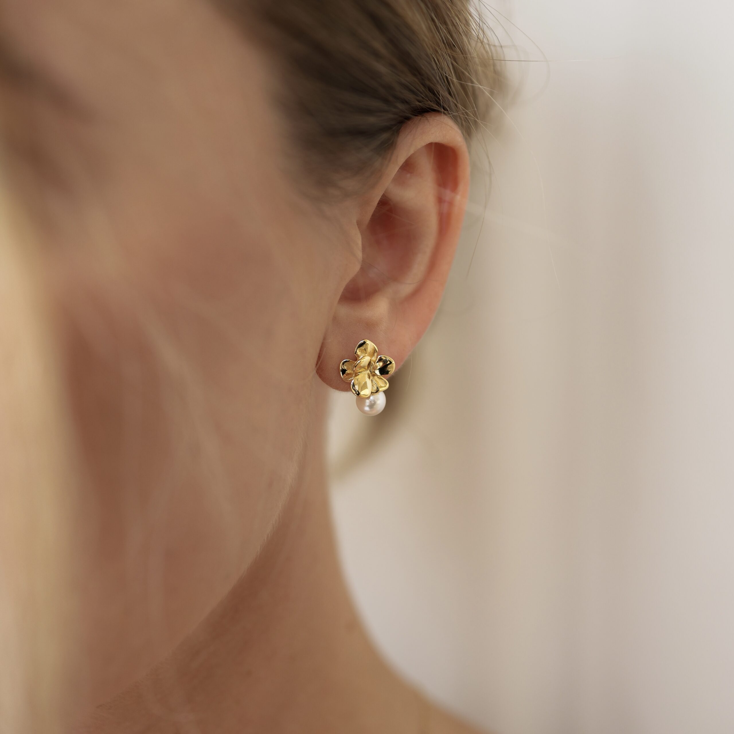 Kolczyki z pozłacanego srebra próby 925 w kształcie kwiatów, wykończone subtelną perłą. Romantyczny akcent, który doda klasy każdej stylizacji.
