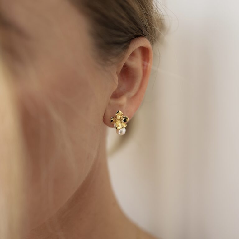 Subtelne kolczyki na sztyfcie wykonane ze srebra pozłacanego, w kształcie koniczyny z dekoracyjnymi nacięciami i wykończone cyrkonią . Klasyka z nutą elegancji – idealne na co dzień i wyjątkowe okazje.