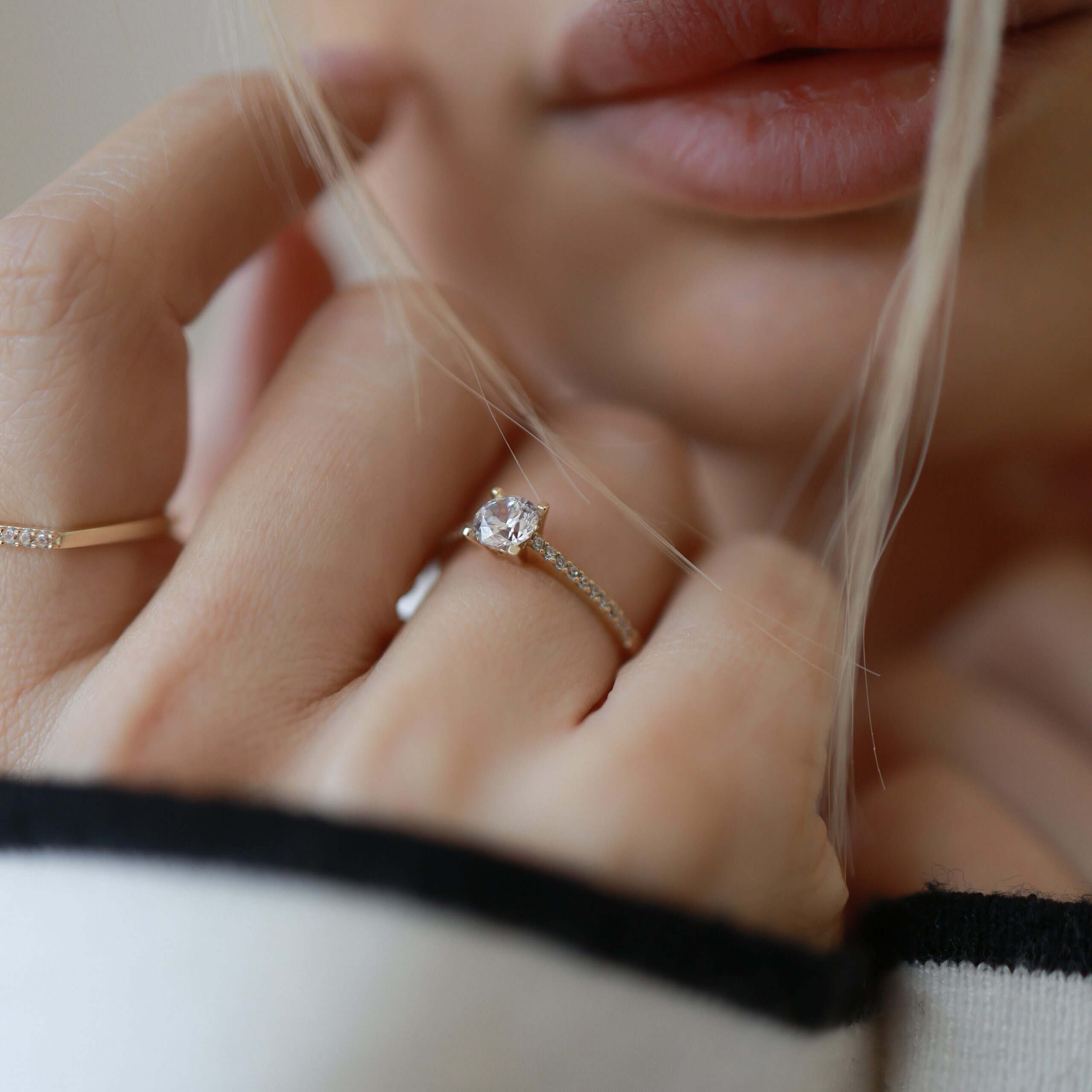 Delikatny złoty pierścionek o klasycznej, ponadczasowej formie z centralnym okrągłym kamieniem osadzonym w subtelnej oprawie. Smukła obrączka zdobiona drobnymi kamieniami podkreśla elegancję i lekkość biżuterii. Idealny wybór na pierścionek zaręczynowy lub wyjątkowy prezent na ważne okazje.